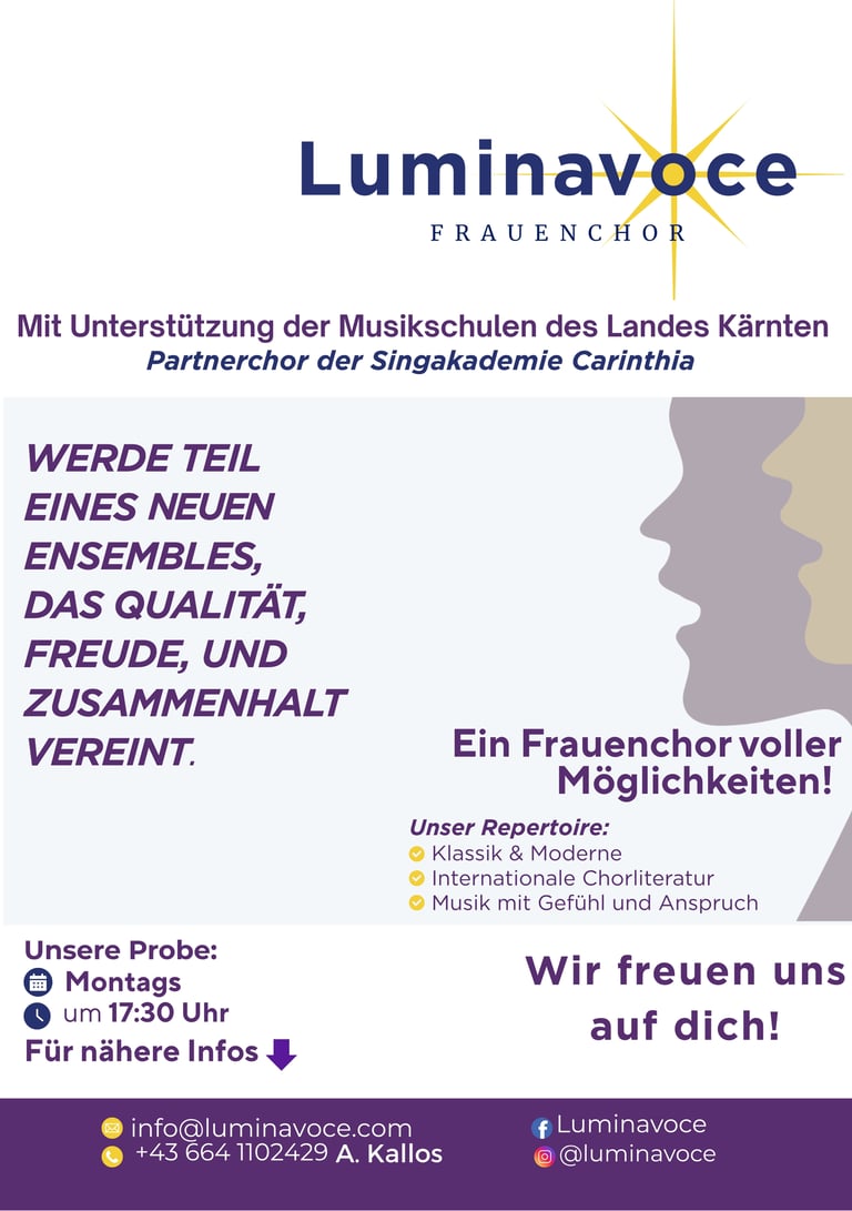 Luminavoce ist mehr als nur Musik. Wir bieten eine inspirierende Gemeinschaft und ein vielseitiges Repertoire für chorerfahrene Sängerinnen, die Freude am Singen und an gemeinsamer Kreativität haben.